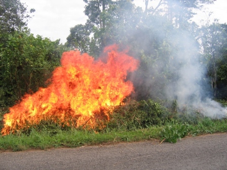 | Ik was net even weggereden om te kijken hoe ver we waren, en toen ik terugkwam stonden ze met zijn zessen druk pratend en wijzend langs de kant van de weg. Wat was er aan de hand? Wel, er was kennelijk een reusachtige slang (zo dik als je been volgens Shannou) langs komen glijden. Ze hebben vergeefs geprobeerd het beest te doden, en nu zat het, boos, ergens onder een bos takken. Omdat niemand het aandurfde te kijken is ook dit weer op zijn Ghanees opgelost: een flinke scheut benzine erop en woesj! de vlam erin. Toen de boel uitgebrand was, bleek er een groot hol onder te zitten, waar de slang vermoedelijk in zat. De gekozen oplossing ligt voor de hand: meer brand. |